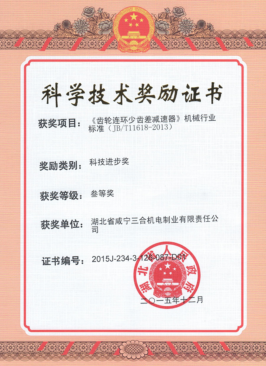 :Third prize of Hubei Province Science and technology progress award of gear link