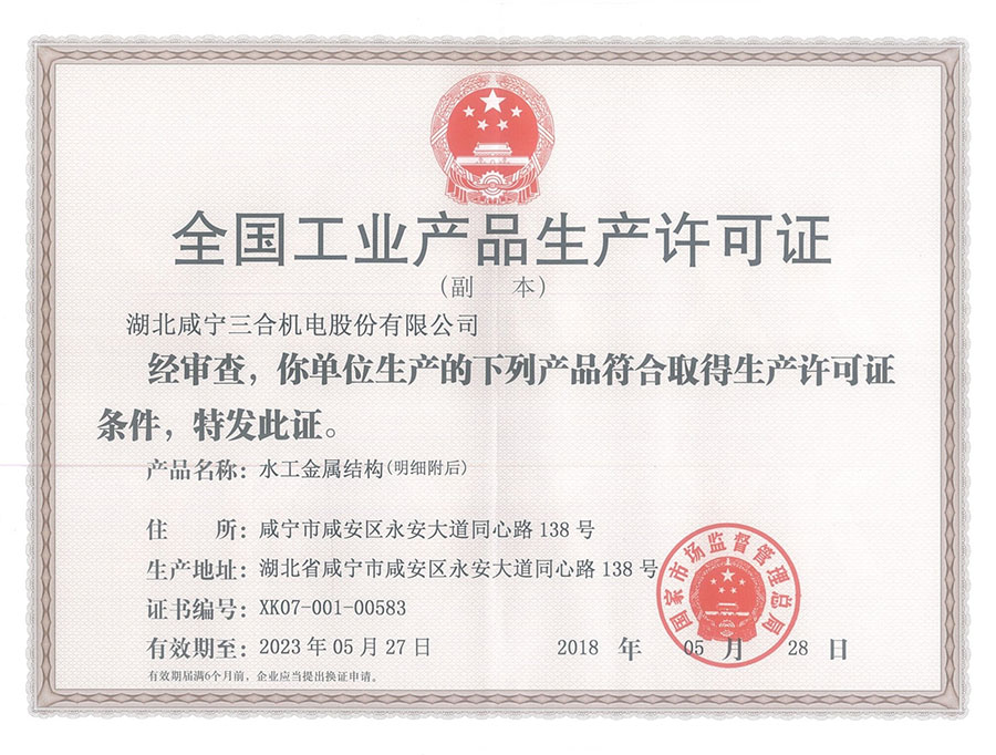 大型螺桿式啟閉機產(chǎn)品使用許可證