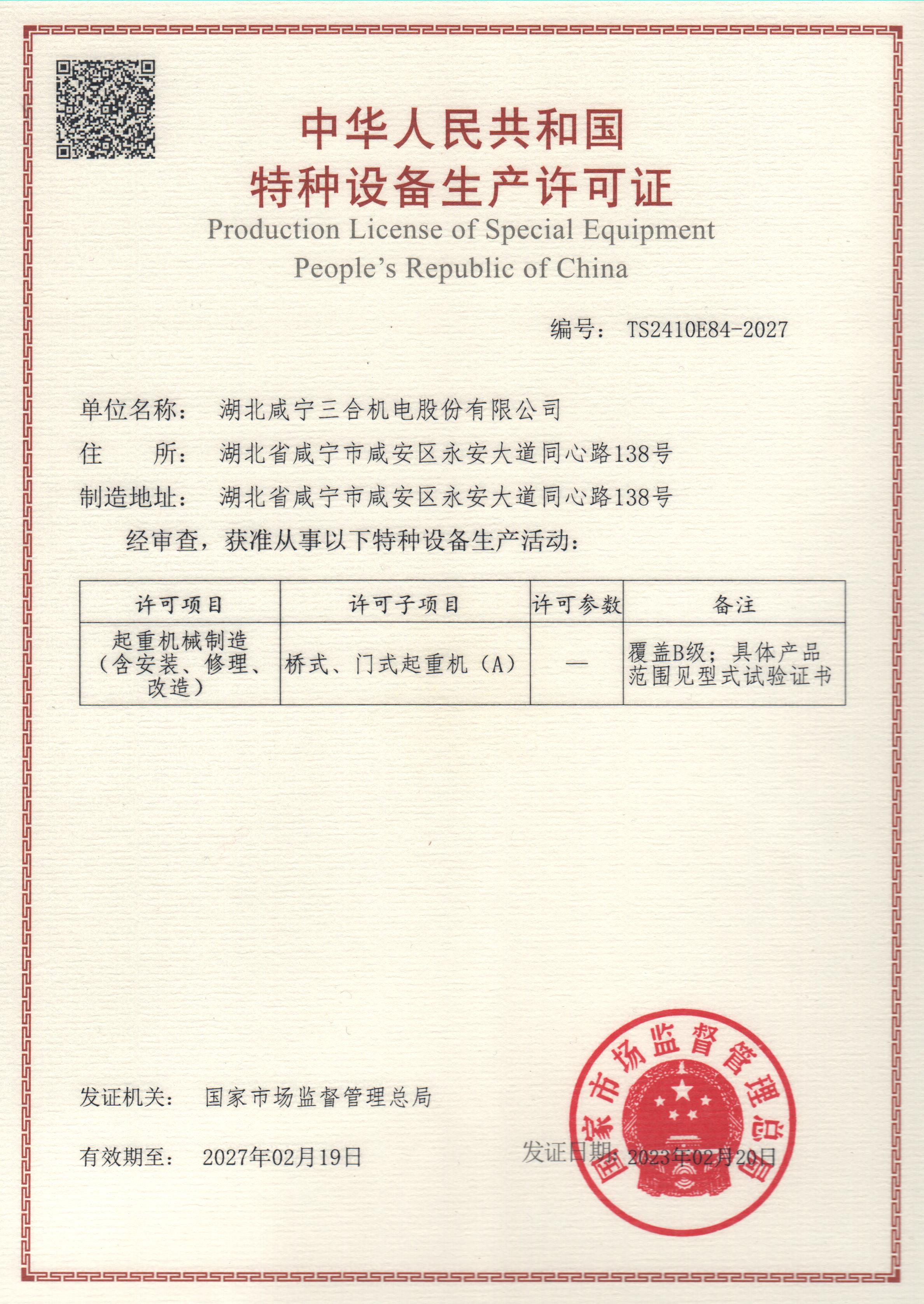 大型移動式啟閉機產(chǎn)品使用許可證