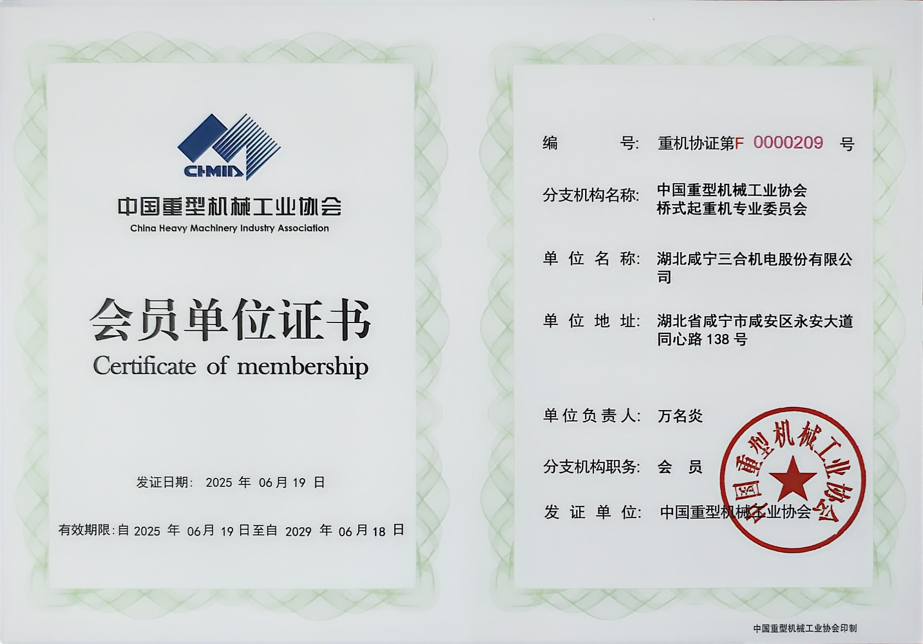 中國(guó)重型機(jī)械工業(yè)協(xié)會(huì)橋式起重機(jī)專業(yè)委員會(huì)會(huì)員單位證書(shū)